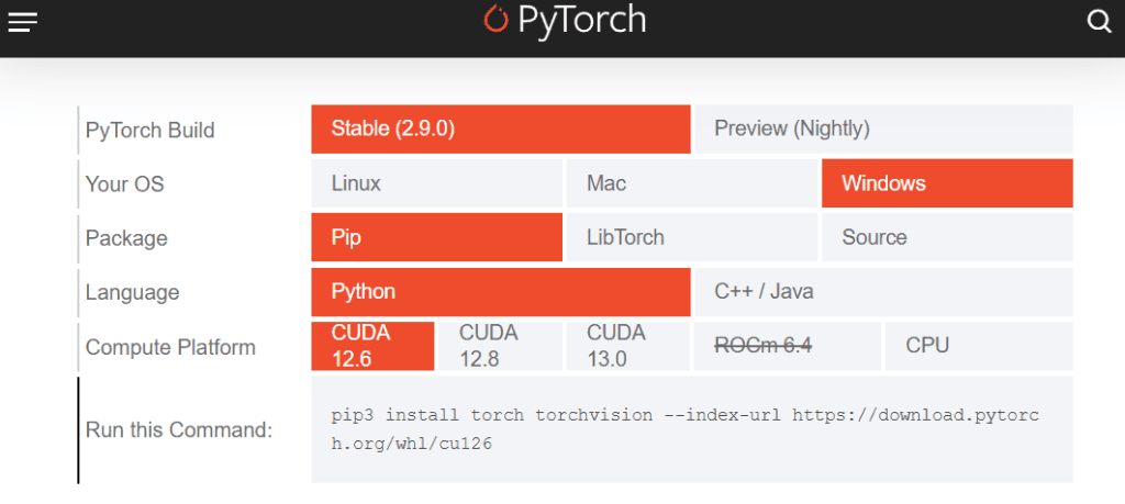 接著安裝相關套件,然後進入到PyTorch依據自己的版本下載。